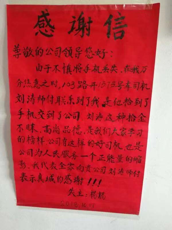 2.10月17日,103路駕駛員劉濤拾到一部OPPO手機(jī),細(xì)心的他按照電話里的信息聯(lián)系到了失主,由于失主在公交車上丟了手機(jī),真沒報任何希望,司機(jī)拾到手機(jī)并主動聯(lián)系失主這一行為,深深的打動了這位叫楊楊的女士,于是她親手寫了一封表揚信交到路隊,她說:劉濤師傅的高尚品德,正是公交人為乘客服務(wù)正能量的一個縮影。