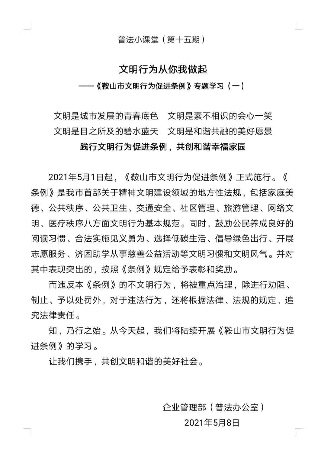 樹立文明風(fēng)尚,提升服務(wù)素質(zhì)交運(yùn)集團(tuán)全面推進(jìn)落實(shí)《鞍山市文明行為促進(jìn)條例》 《鞍山市文明行為促進(jìn)條例》是我市首部關(guān)于精神文明建設(shè)領(lǐng)域的地方性法規(guī),是我市精神文明建設(shè)的重要抓手,2021年5月1日起正式實(shí)施。為培育和踐行社會主義核心價(jià)值觀,引導(dǎo)和促進(jìn)文